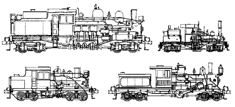 Geared Locomotive Comparison This drawing shows a general relative size and design comparison between (clockwise from upper left) a Shay, "baby" Shay, Climax and Heisler.