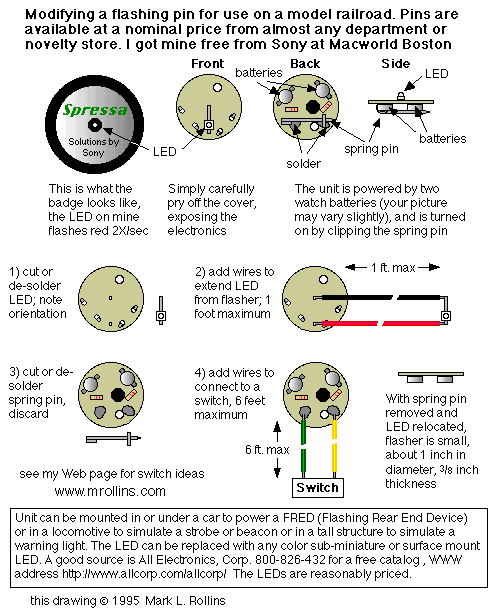 Modify a novelty flashing pin to be a useful model railroad flashing circuit.