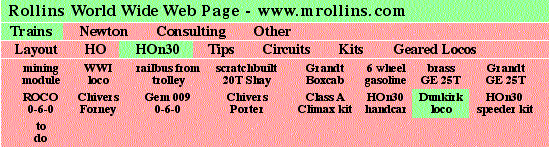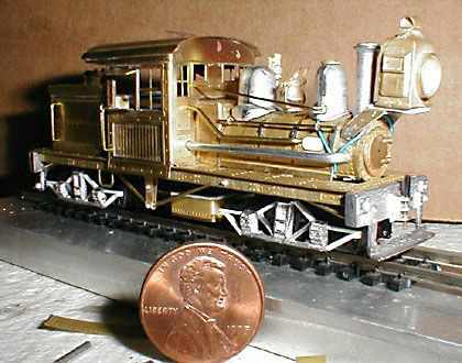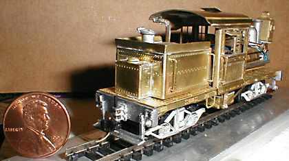 This locomotive is based on a Brick Price etched brass kit. It's a great kit, and can be used (depending on your skill and level of masochism) to build a Climax, Heisler, Shay or Dunkirk. It even has a cutaway cab side if you're building a Shay. Information on the kit, as well as for orders by check or money order, look at Brick's web page. For credit card orders, the kits can be found at B & F Hobby Shop, CA (west coast USA), or Train & Trooper, ME (east coast USA).