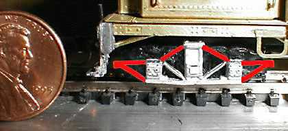 The picture above shows how I made trucks resembling those on a Dunkirk. Start with two Keystone Locomotive Works logging junk kits, which includes two smaller Shay sideframes per kit (total 4). These are cut away until you have something resembling the sideframe above, without the red, The pieces marked in red are styrene strips bent as appropriate and glued onto the sideframe. When done these are epoxied to the Life-Like diesel sideframes, which have been smoothed by sanding the details flat. A small square of styrene is glued over a hole in the center of the Shay sideframe.