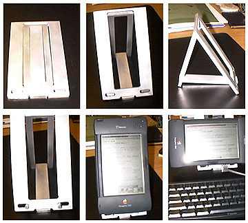 Also please note the plans for this stand are copyright by me, this does not preclude non-commercial duplication. Feel free to make a stand for yourself, improve on it, have fun! If you want to make some commercially, talk to me - I'll probably let you if I get one for free. You could also re-size the basic plan for a Palm Pilot, Psion or (shudder) a WinCE machine.