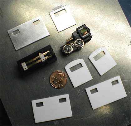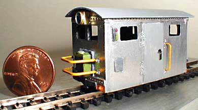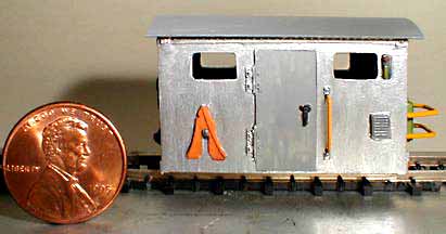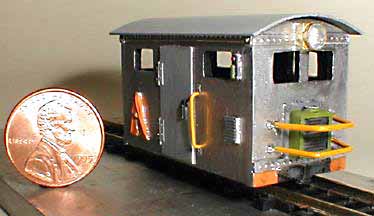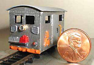 The following pictures show the painted model as built from the kit. The disk-shaped copper object is a US penny (7.5 mm diameter). The roof, drive unit and handrails/guardrails are not included in the kit. The unit - if powered by the Bachman 0-4-0, can easily be re-gauged to HOn3. The unit is too narrow to power for standard gauge HO, but looks great as a static model!